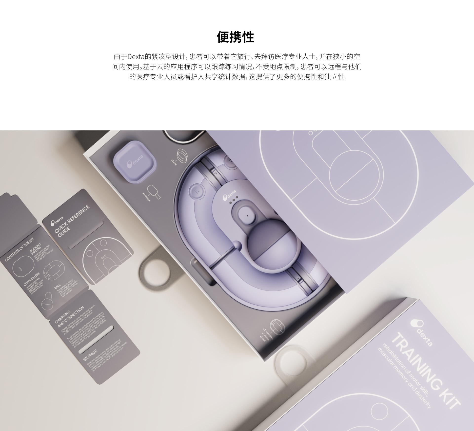 由于 De × ta 的緊湊型設(shè)計,患者可以帶著它旅行、去拜訪醫(yī)療專業(yè)人士,并在狹小的空間內(nèi)使用?;谠频膽?yīng)用程序可以跟蹤練習(xí)情況,不受地點(diǎn)限制,患者可以遠(yuǎn)程與他們的醫(yī)療專業(yè)人員或看護(hù)人共享統(tǒng)計數(shù)據(jù),這提供了更多的便攜性和獨(dú)立性