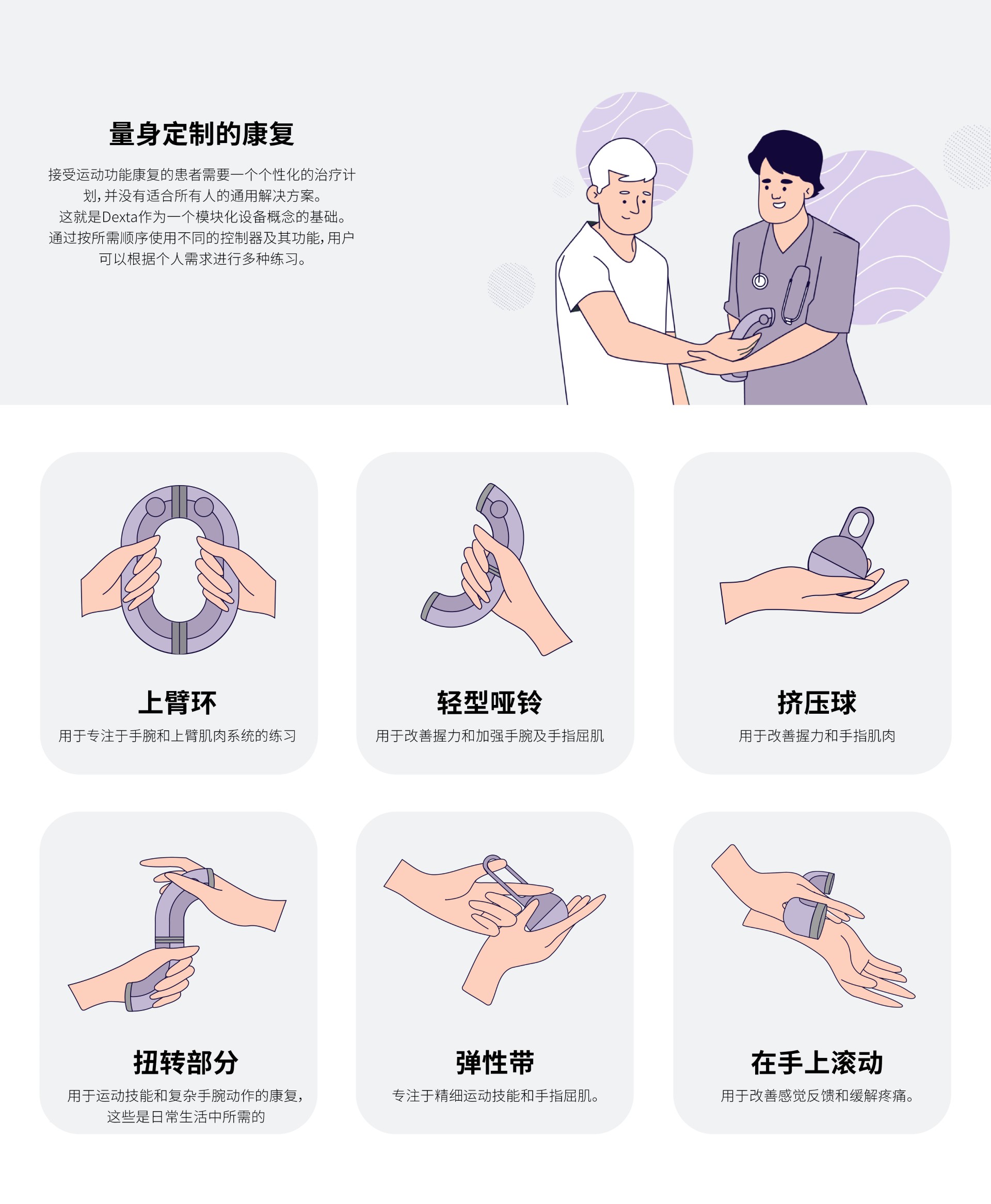 接受運(yùn)動功能康復(fù)的患者需要一個個性化的治療計劃,并沒有適合所有人的通用解決方案。這就是 Dexta 作為一個模塊化設(shè)備概念的基礎(chǔ)。通過按所需順序使用不同的控制器及其功能,用戶可以根據(jù)個人需求進(jìn)行多種練習(xí)。