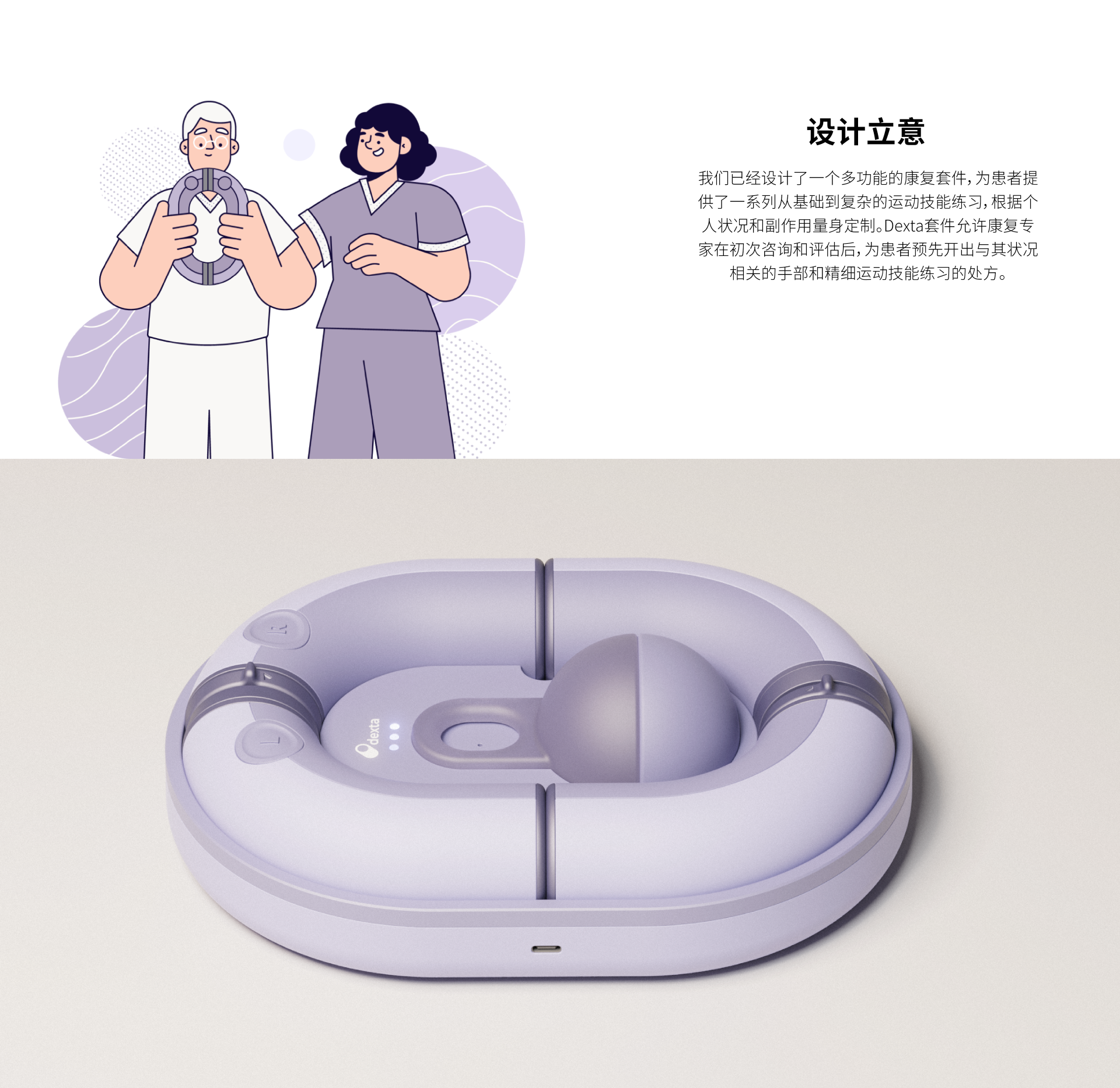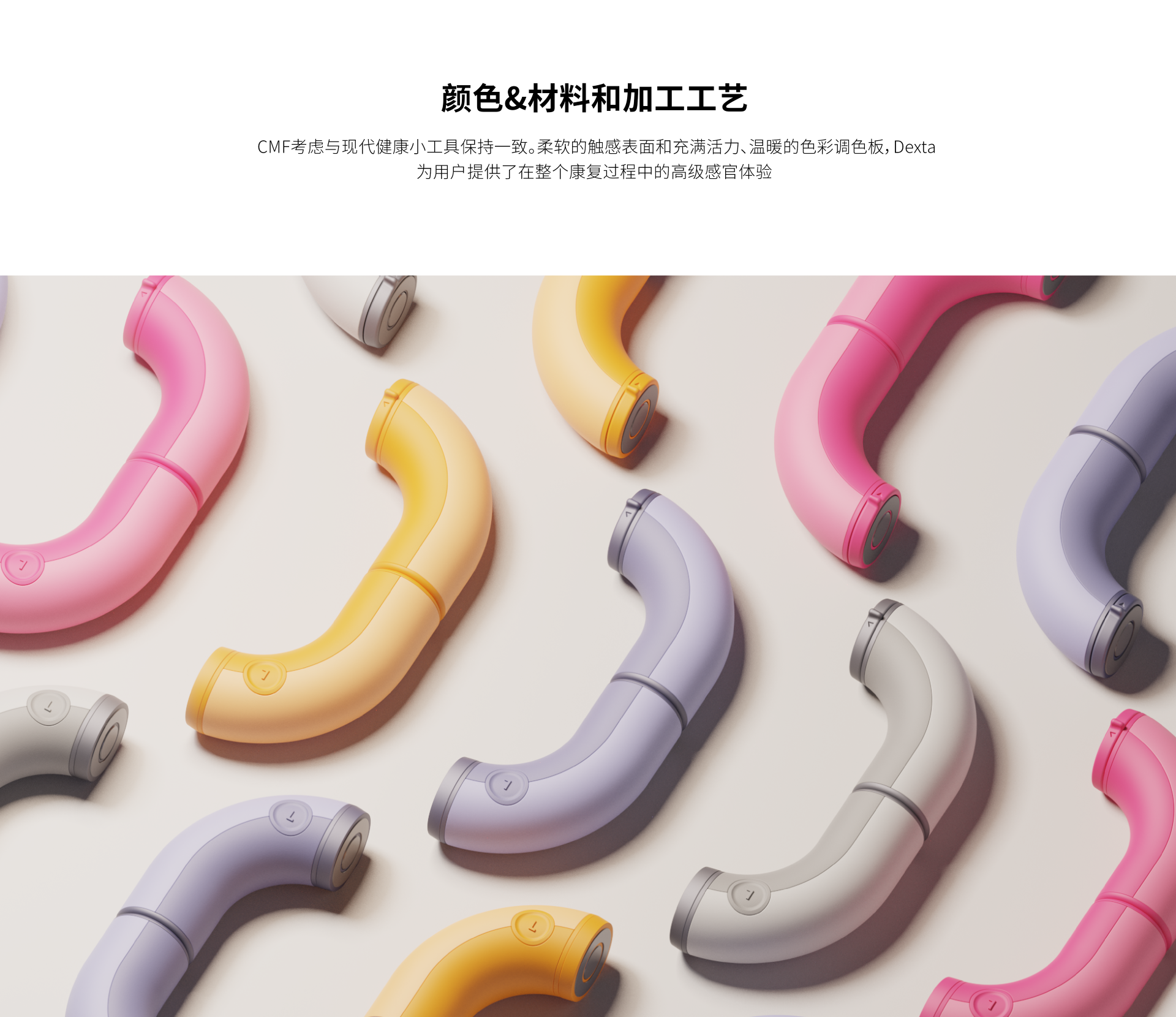 CMF考慮與現(xiàn)代健康小工具保持一致。柔軟的觸感表面和充滿活力、溫暖的色彩調(diào)色板,Dexta為用戶提供了在整個康復(fù)過程中的高級感官體驗
