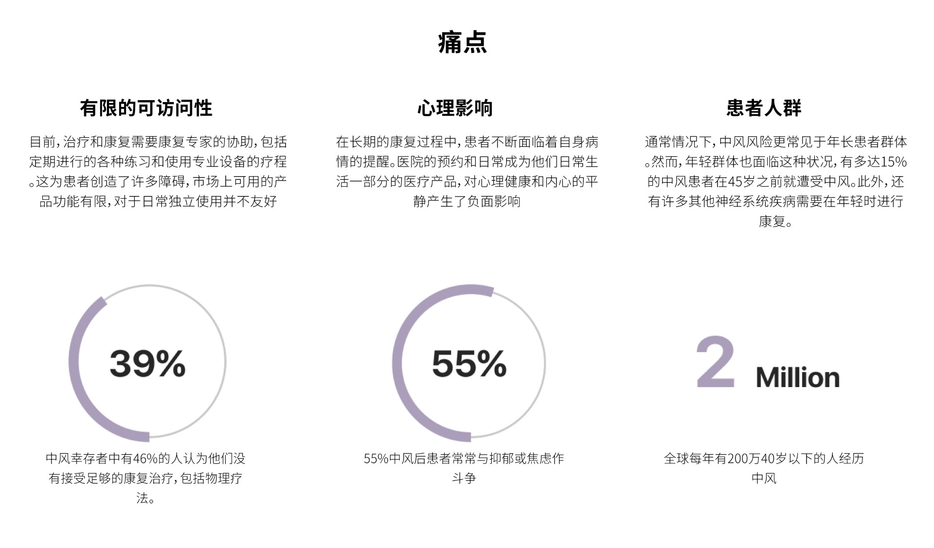 產(chǎn)品痛點(diǎn):有限的可訪問性:目前,治療和康復(fù)需要康復(fù)專家的協(xié)助,包括定期進(jìn)行的各種練習(xí)和使用專業(yè)設(shè)備的療程。這為患者創(chuàng)造了許多障礙,市場上可用的產(chǎn)品功能有限,對于日常獨(dú)立使用并不友好心理影響:在長期的康···