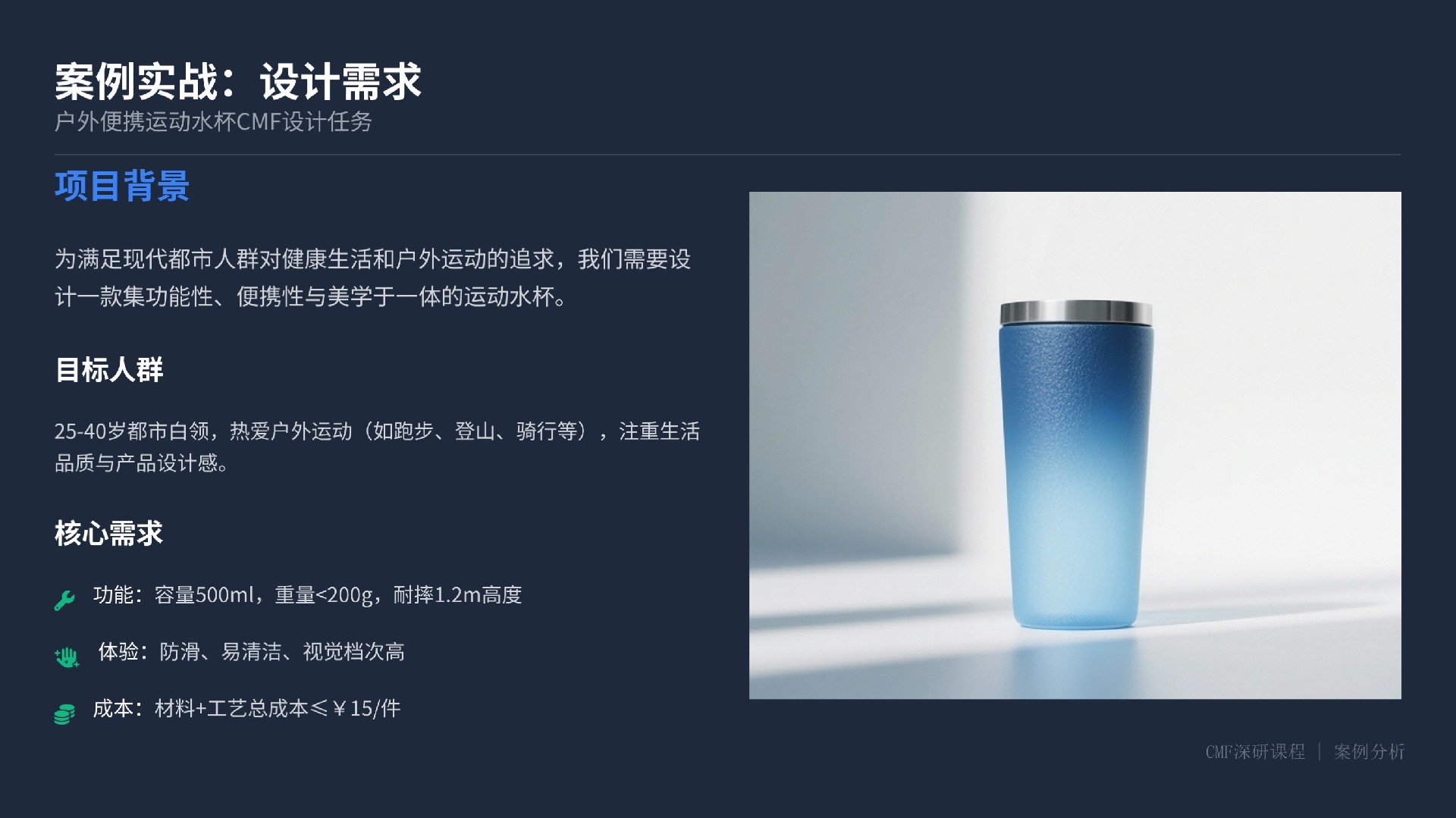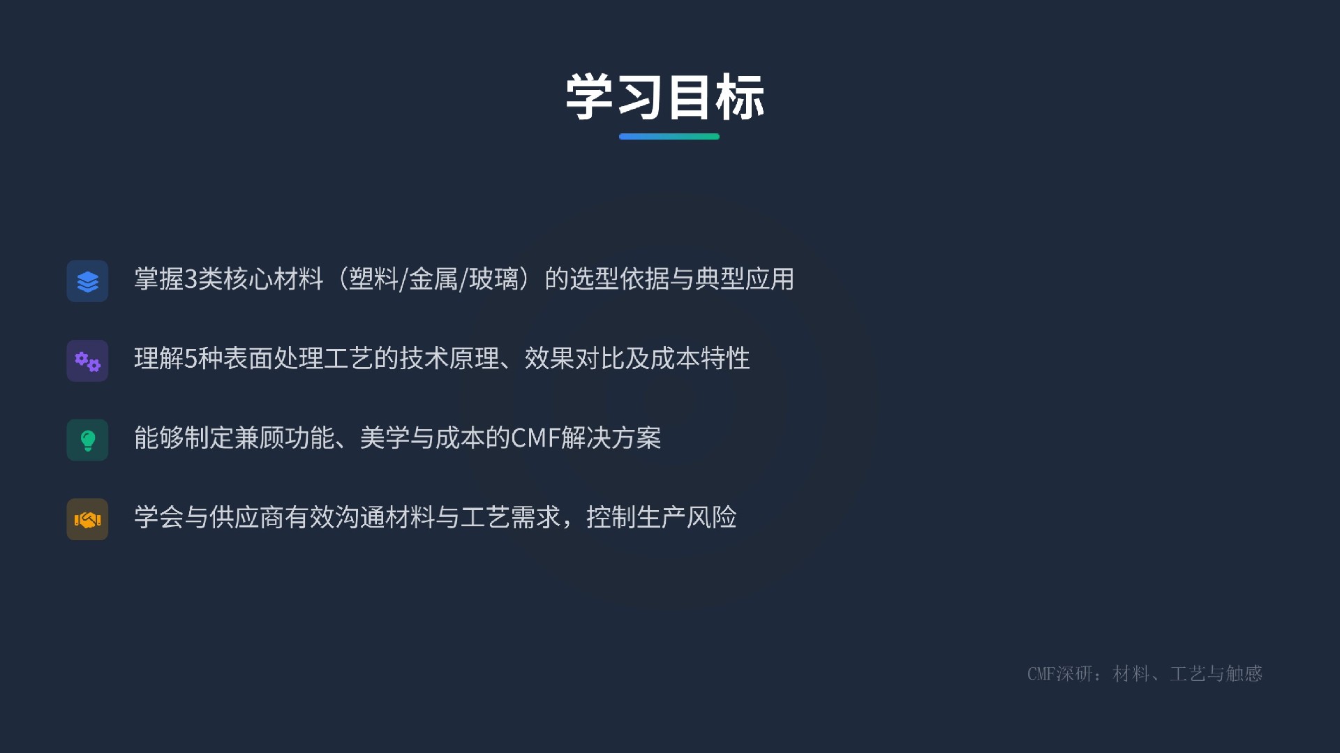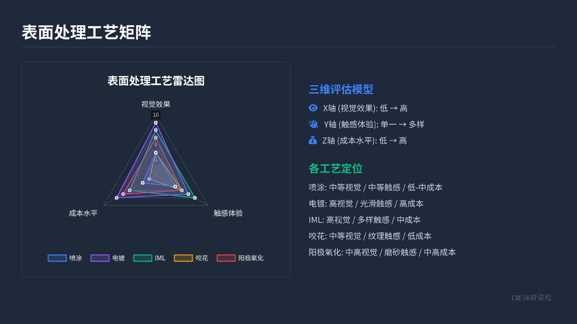 當(dāng)產(chǎn)品的整體形態(tài)確立后,CMF(Color, Material, Finishing)設(shè)計(jì)便是為其注入靈魂、定義品質(zhì)的關(guān)鍵環(huán)節(jié)。它決定了用戶“看到什么、摸到什么、感受到什么”,是連接視覺(jué)美學(xué)與物理體驗(yàn)的橋梁。本課將深入CMF的核心領(lǐng)域,探討如何通過(guò)材料與工藝的精準(zhǔn)選擇,塑造打動(dòng)人的產(chǎn)品體驗(yàn)。