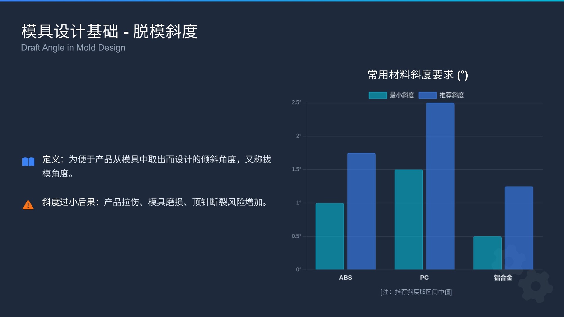 是什么:模具型腔側(cè)壁必須設(shè)計(jì)的傾斜角度,否則產(chǎn)品將無法頂出或表面會被刮傷。