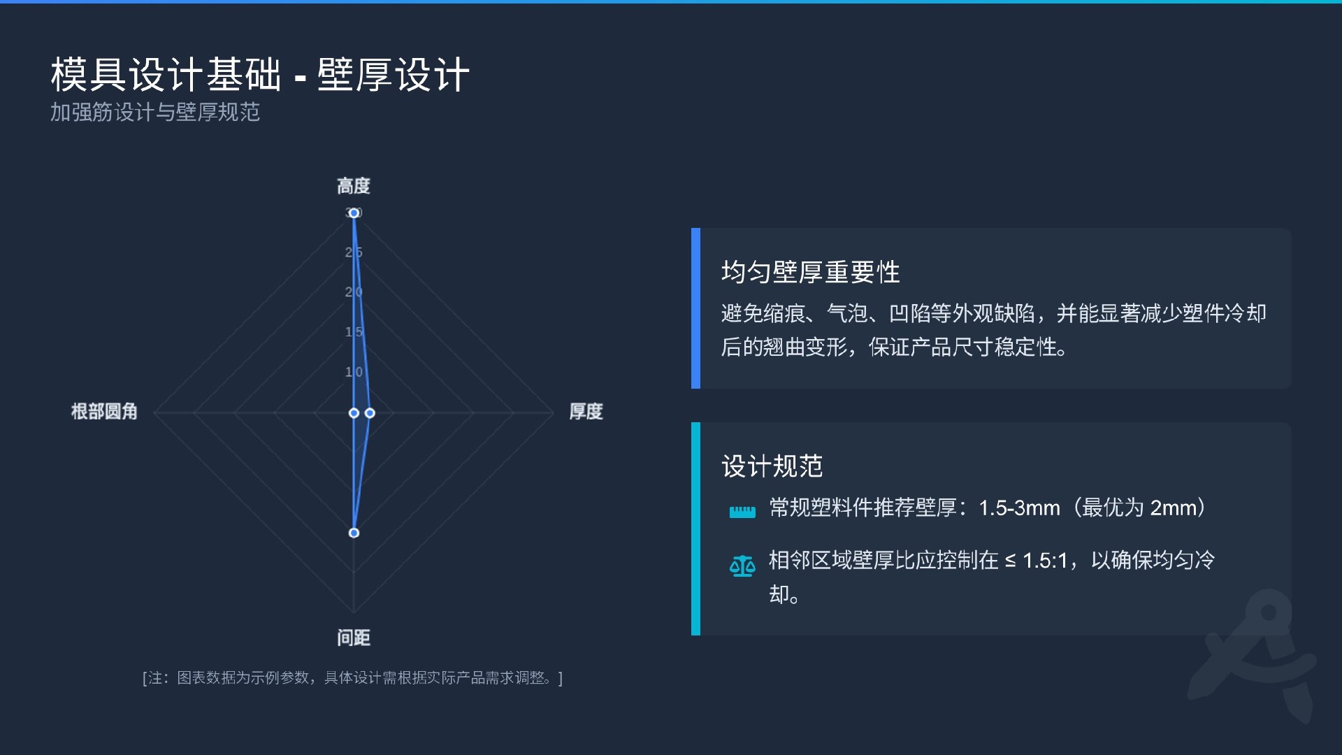 厚度:筋的厚度不得超過其連接的主壁厚的 50-60%(以防背面產(chǎn)生縮痕)。