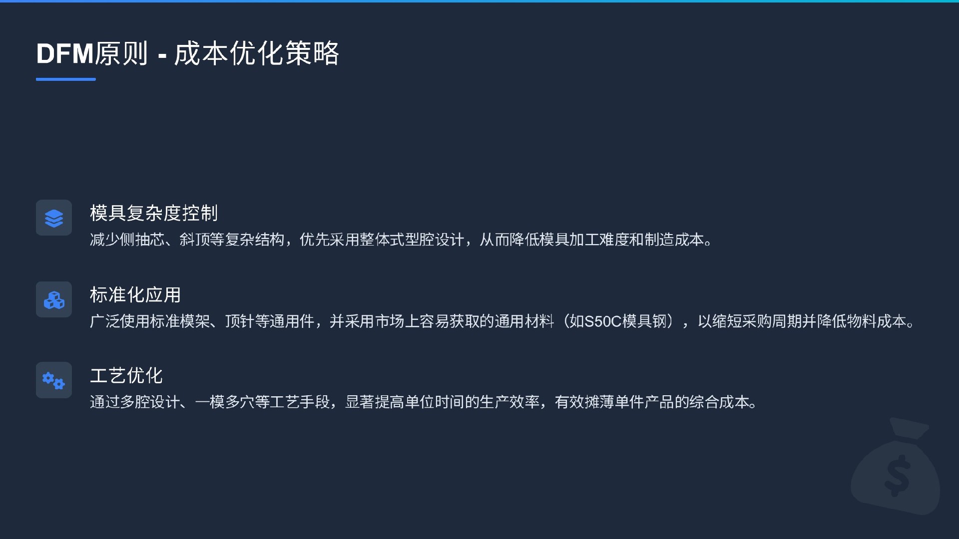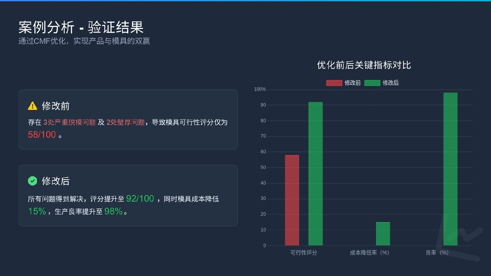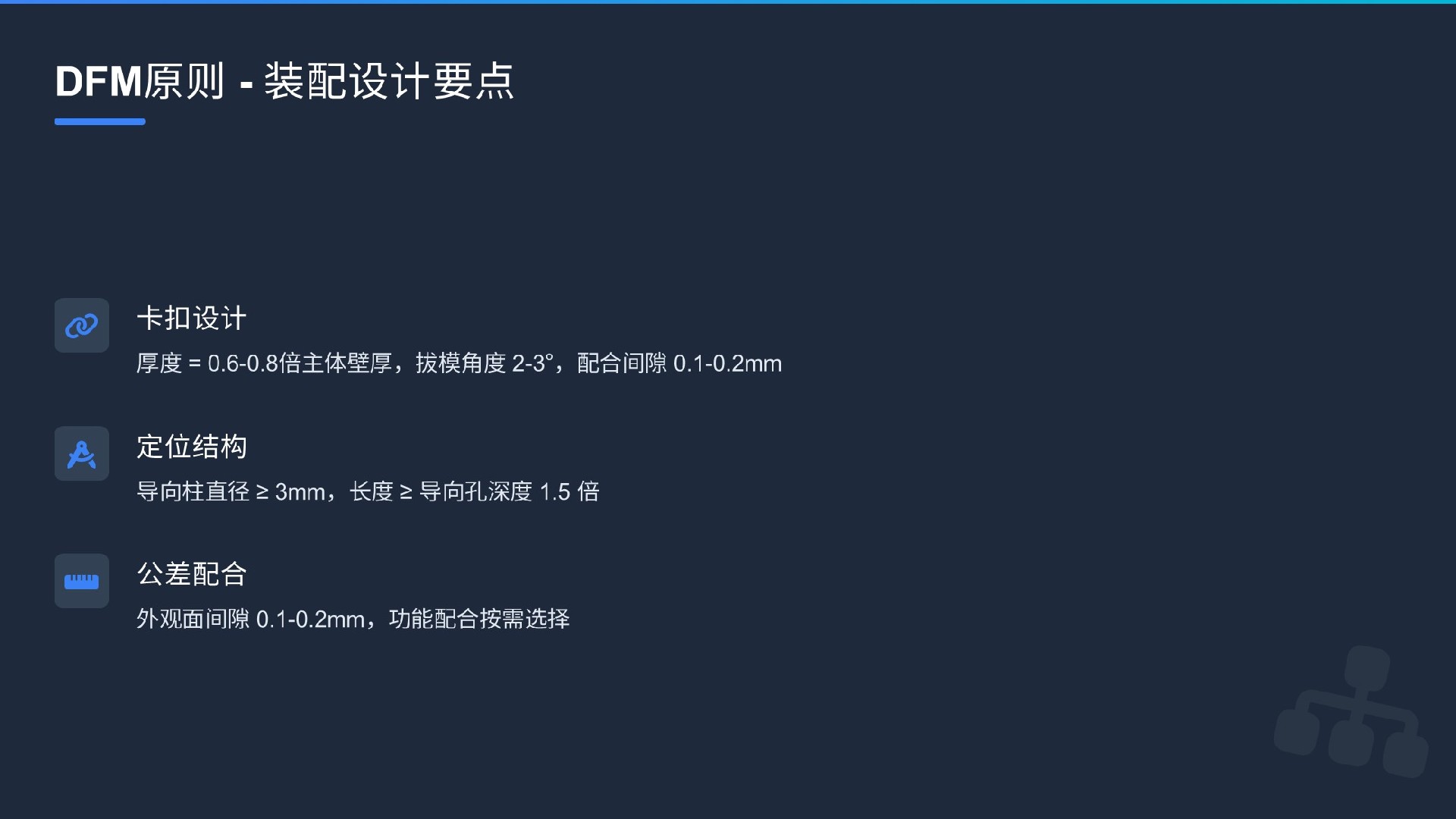 簡化設(shè)計(jì):不斷追問“這個(gè)特征是否必需?能否用更簡單的方式實(shí)現(xiàn)?”更少的零件、更簡單的結(jié)構(gòu)意味著更低的模具成本、更少的裝配工序和更高的可靠性。